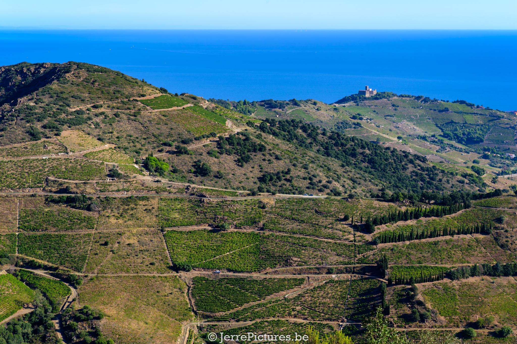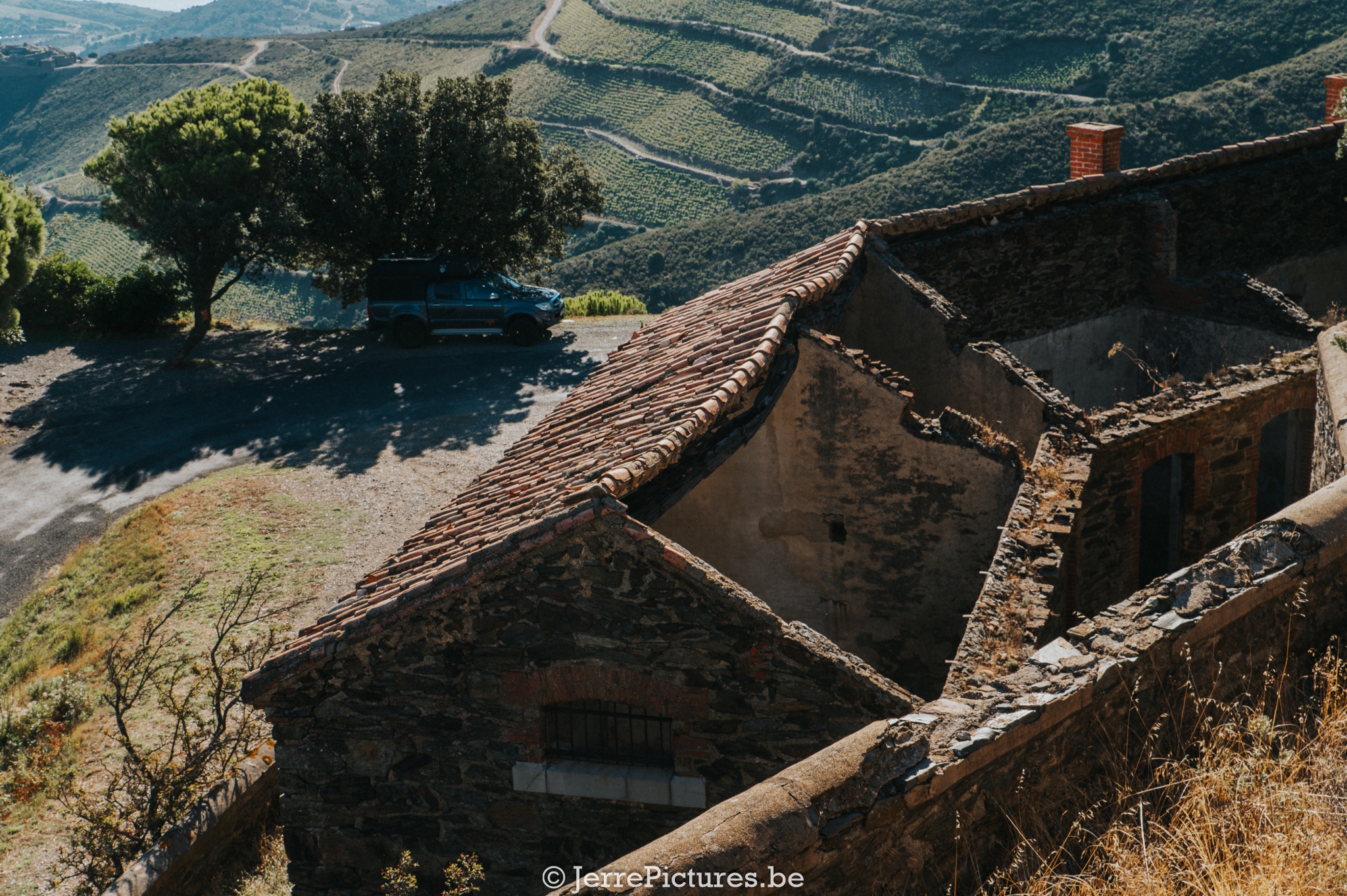Vanaf dit uitkijkplateau, naast een verweerde ruïne (mogelijk een oude kazerne of opslag), ontvouwt zich een 360° uitzicht dat je stil maakt: zonovergoten wijngaarden van Banyuls en Collioure uitrollen als een groen tapijt, richting de zee, … en ja de Pyreneeën doemen op, en ergens daarachter lonkt Spanje.