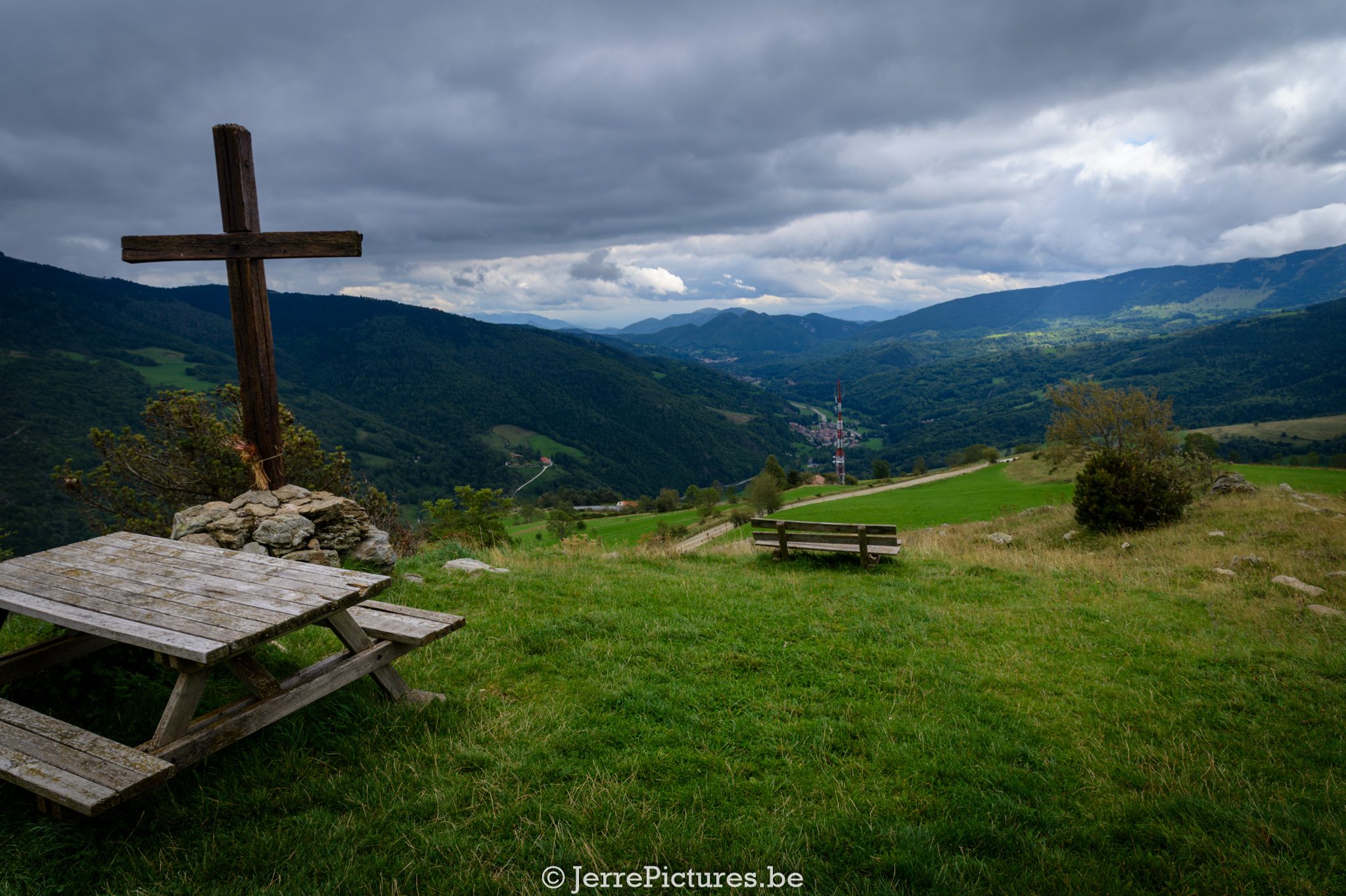 Onze offroad-avontuur begon bij de Mirador de la Creu de Fusta (het Uitkijkpunt van het Houten Kruis). Normaal gesproken word je hier getrakteerd op een breedbeeld uitzicht over de Vallei van Camprodon dat zo in een reisbrochure kan. Wij stapten uit, klaar voor de oohs en aahs, maar werden begroet door een ijzige wind die dwars door onze kleren sneed.